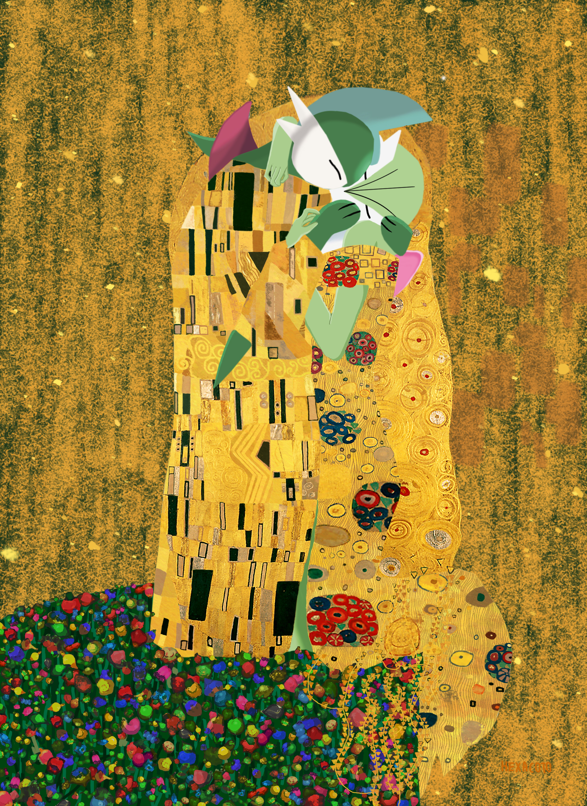 pokekissI combined two of my favourite things — Pokémon, and Art Nouveau. The result is The Poké-Kiss, from Gustav Klimt’s The Kiss and featuring generation III Pokémon Gardevoir and Gallade.