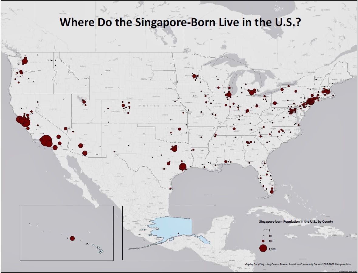 Former political counsellor to the Singapore Embassy Daryl Sng created a post on his blog about where Singaporeans are residing in the United States, using ArcGIS, a geographic information system software. He uses county-level data from the Census Bureau’s American Community Survey, 2005-2009, which shows some 26,754 people who claim Singapore as their place of birth. Of course, that includes children of expatriates born in Singapore and Singaporeans who have given up their citizenship. Sng also states that the new 2008-2012 census data was recently released, showing some 29,173 people who indicate Singapore as their place of birth living in the United States.
