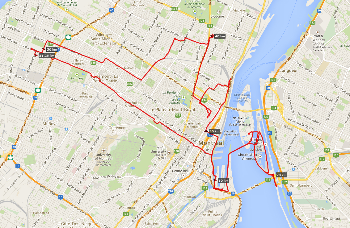 A raising bridge was raised so some private yachts can pass through. Meanwhile, us non-1%-ers twiddled our bicycles (and unicycle) while we waited for the bridge to come back down. I didn’t wait long enough for it to come down, because 15 minutes later the bridge was still up. So I backtracked all the way I came — something I really hate to do — and made it back onto the mainland of Montreal.
